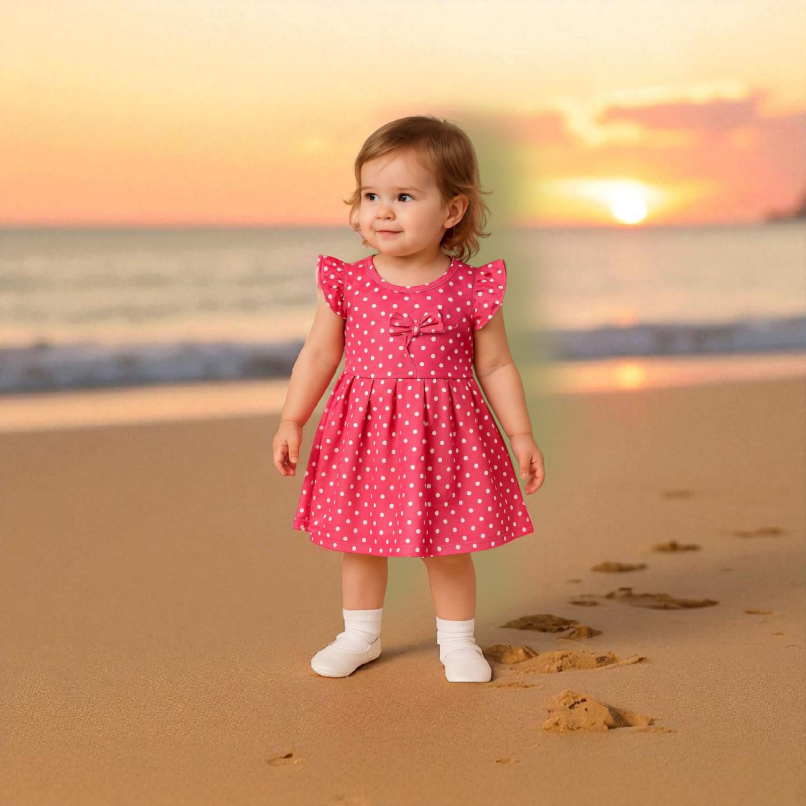 Cute and classy, this polka dot dress is a must-have for your little one’s wardrobe. Featuring flutter sleeves, a front bow tie, and a flared skirt, it’s perfect for parties, birthdays, and everyday outings. Made from soft Lycra fabric, it ensures comfort and style all day long.