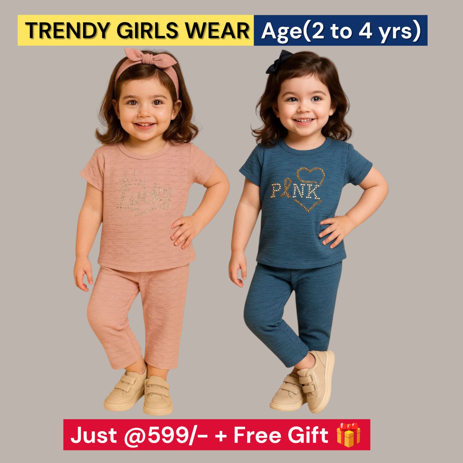 Keep your little one comfy and stylish with this 2-piece girls’ outfit set featuring a soft short-sleeve T-shirt and matching pants. Available in classic tones, these sets are designed with fun glittery prints and a relaxed fit — perfect for playdates, outings, or casual everyday wear.